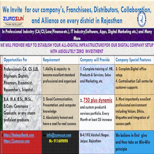 Zumosun Soft and Thelegal Bank Group Invite and accept the professional partners, alliance and collaboration on every district of Rajasthan in the industry of IT Soft infrastrcuture, Digital marketing, Design & print, Chartered Accountant (CA), Company Secretary(CS), Law, Legal , Business setup and business automation.Our Group have the chamber of professionals including, Engineers, Chartered Accountant (CA), Company Secretary (CS), lawyers, Advocates, Economist, Financers, Researchers, Innovatoes, Inventors and Scientist for a 360 degree integration of professional to provide the highest degree of professional On Stop Business Solution.