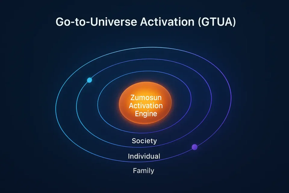 The Go-to-Universe Activation Framework operates through the Zumosun Activation Engine (ZAE) — a dynamic model that identifies, activates, and scales intelligence across every orbit of existence.
