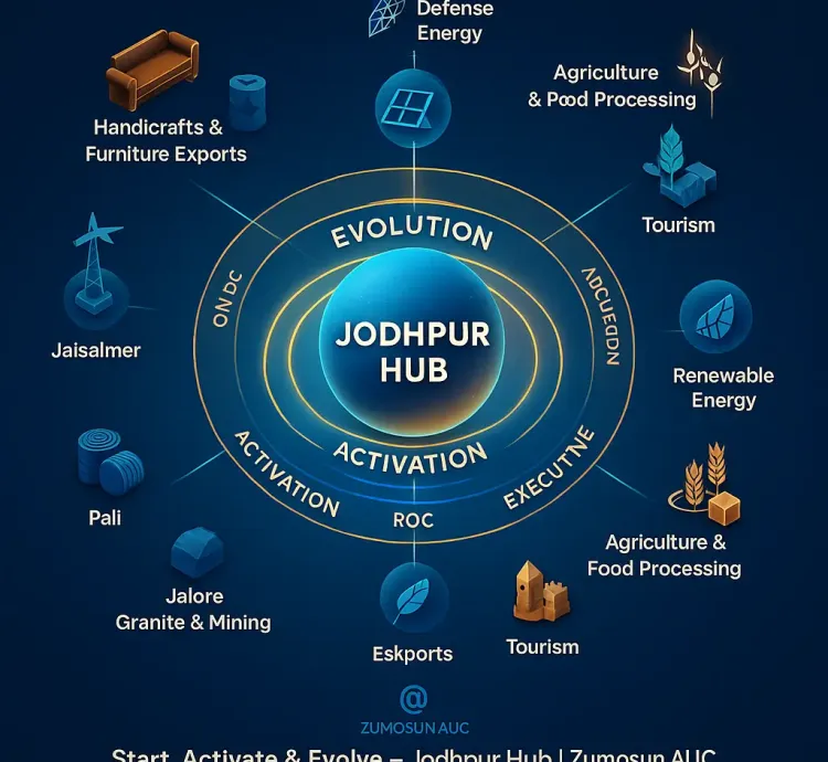 Jodhpur, the Blue City, is more than a desert heritage jewel — it is Rajasthan’s handicrafts capital, defense corridor, and renewable energy hub. With Zumosun Activated Universe & Civilization (AUC), your business can Start, Activate & Evolve across Jodhpur and its connected districts: Barmer, Pali, Nagaur, Jaisalmer, and Jalore.