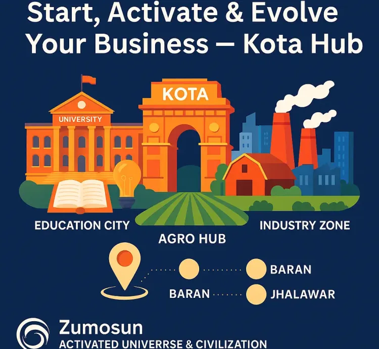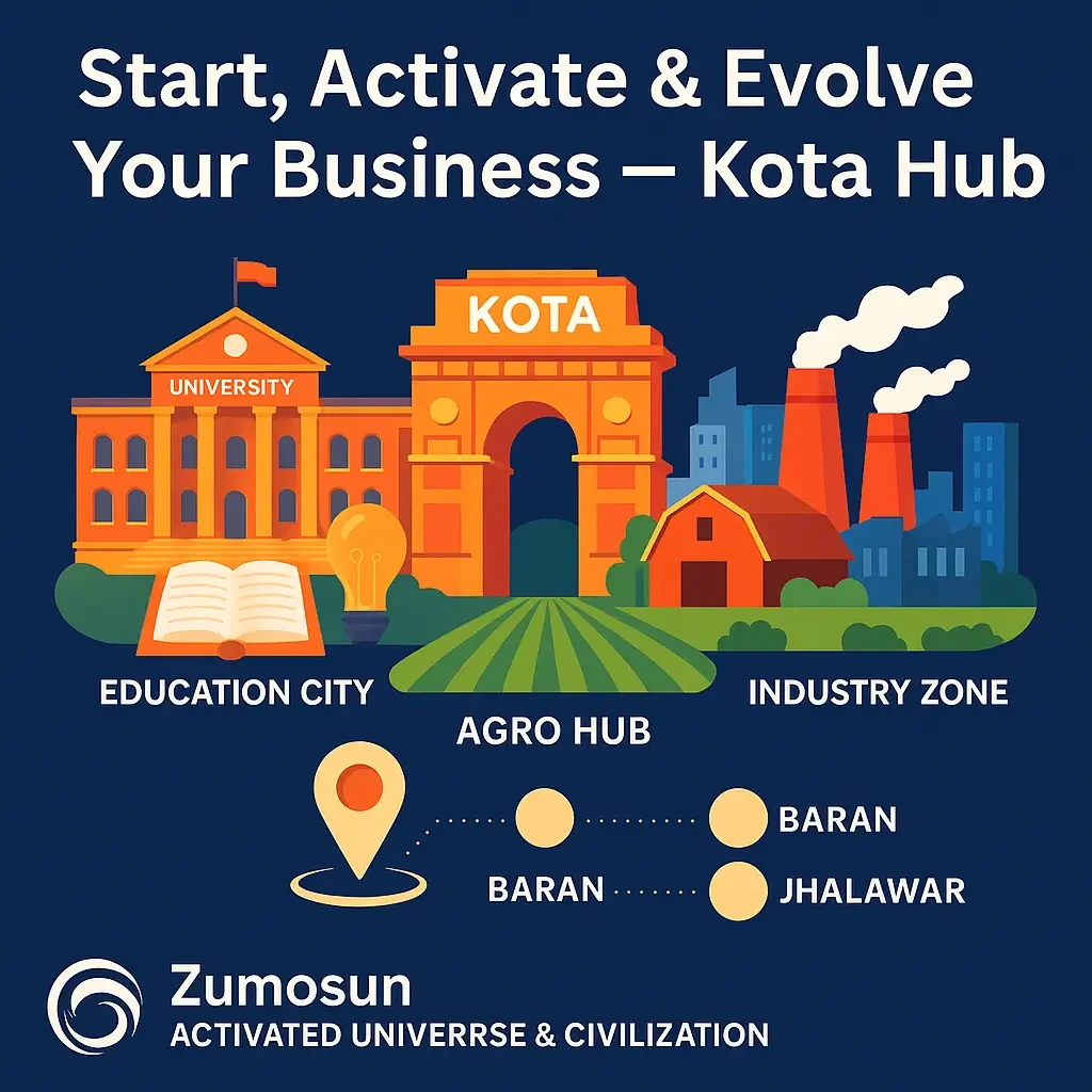 Kota, India’s Education City and Rajasthan’s industrial-agro hub, powers startups, SMEs, and large enterprises with a unique blend of coaching, industries, and agriculture. With Zumosun Activated Universe & Civilization (AUC), your business can Start, Activate & Evolve across Kota and its connected districts: Bundi, Baran, and Jhalawar.