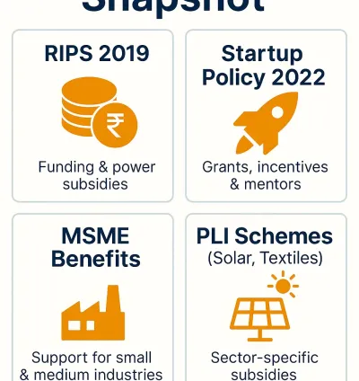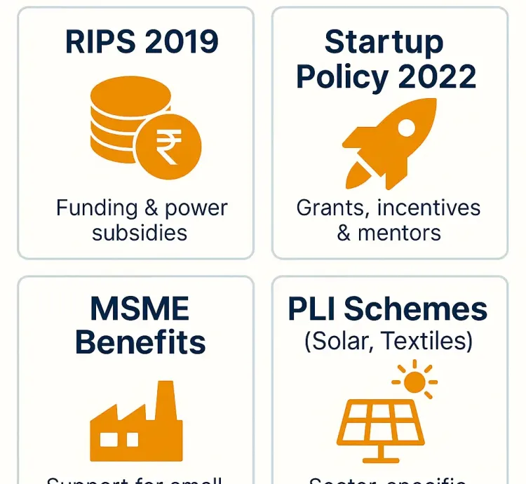 RIPS 2019 subsidies, Startup Policy 2022, PLI schemes.