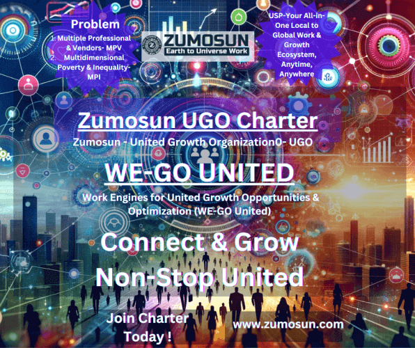 हम, ज़ुमोसुन: यूनाइटेड ग्रोथ ऑर्गनाइजेशन (UGO) के सदस्य, यह संकल्प लेते हैं कि वैश्विक स्तर पर सतत और मापक विकास और सफलता के लिए एक मजबूत मंच का निर्माण करेंगे। हमारा उद्देश्य यह है कि हम सभी राष्ट्रों, उद्योगों, व्यवसायों और व्यक्तियों को वैश्विक संसाधनों और ज्ञान तक पहुंच प्रदान कर सकें ताकि वे अपने दीर्घकालिक लक्ष्यों को हासिल कर सकें। हम एक ऐसा वैश्विक सहयोगी वातावरण विकसित करेंगे, जो सभी सदस्यों के लिए समानता, शांति, और समृद्धि का मार्ग प्रशस्त करे।